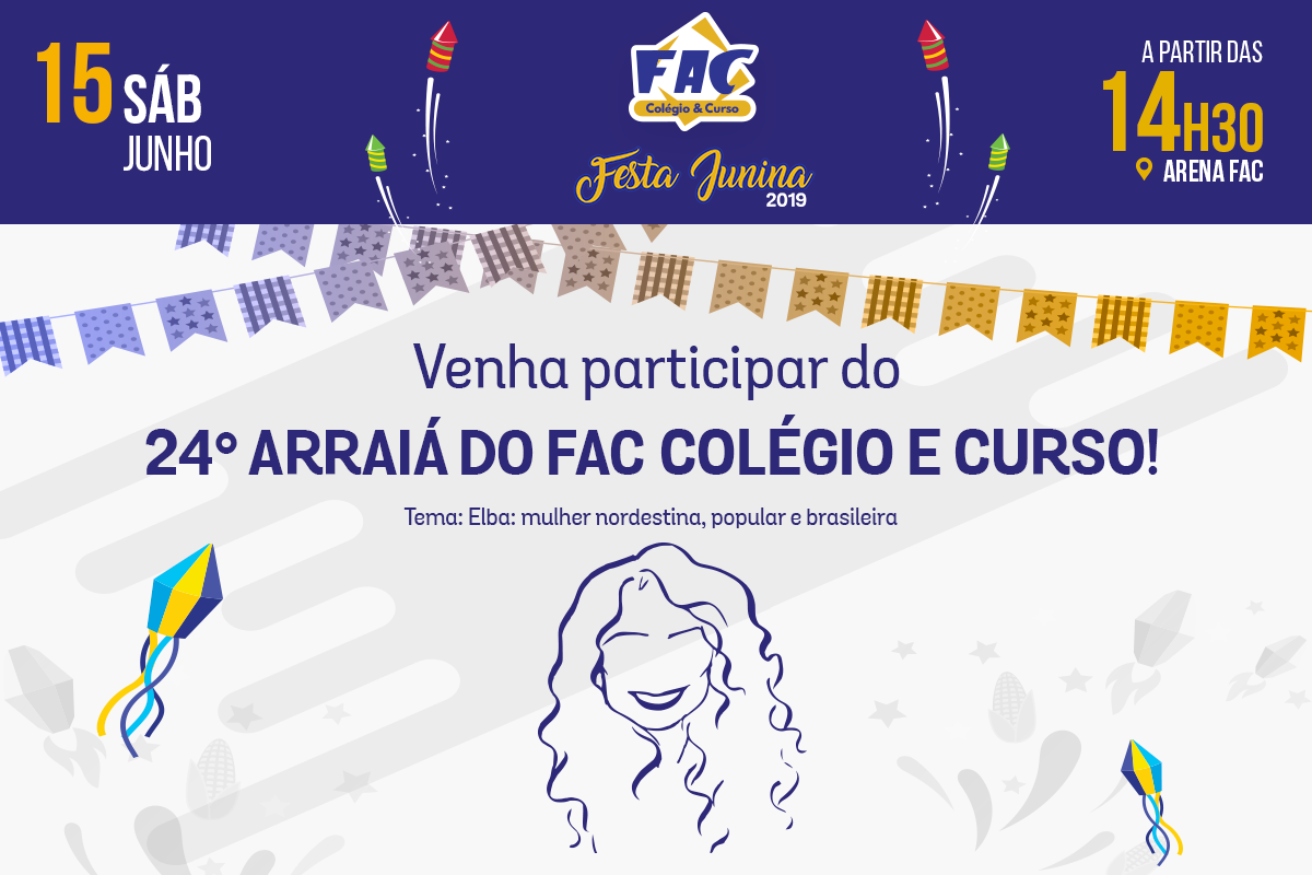 FAC Colégio e Curso2019-06-11T15:08:42-03:00Preparem-se para pular a fogueira e convidar o seu par, porque vem aí o 24° Arraiá do FAC Colégio e Curso! Sábado (15), a partir das 14h30, venha conosco participar